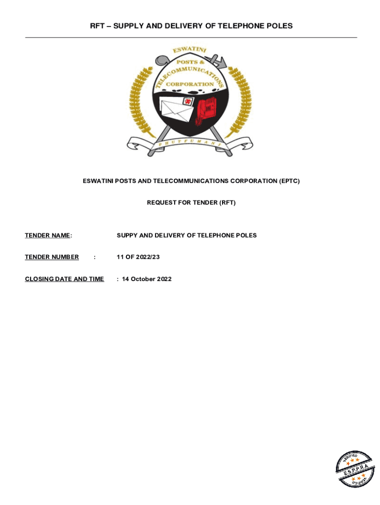 FT SUPPLY AND DELIVERY OF TELEPHONE POLES ___ESWATINI POSTS AND TELECOMMUNICATIONS CORPORATION (ETC) REQUEST FOR TENDER (FT)TENDER NAME: TENDER NUMBERSUPPY AND DELIVERY OF TELEPHONE POLES :CLOSING