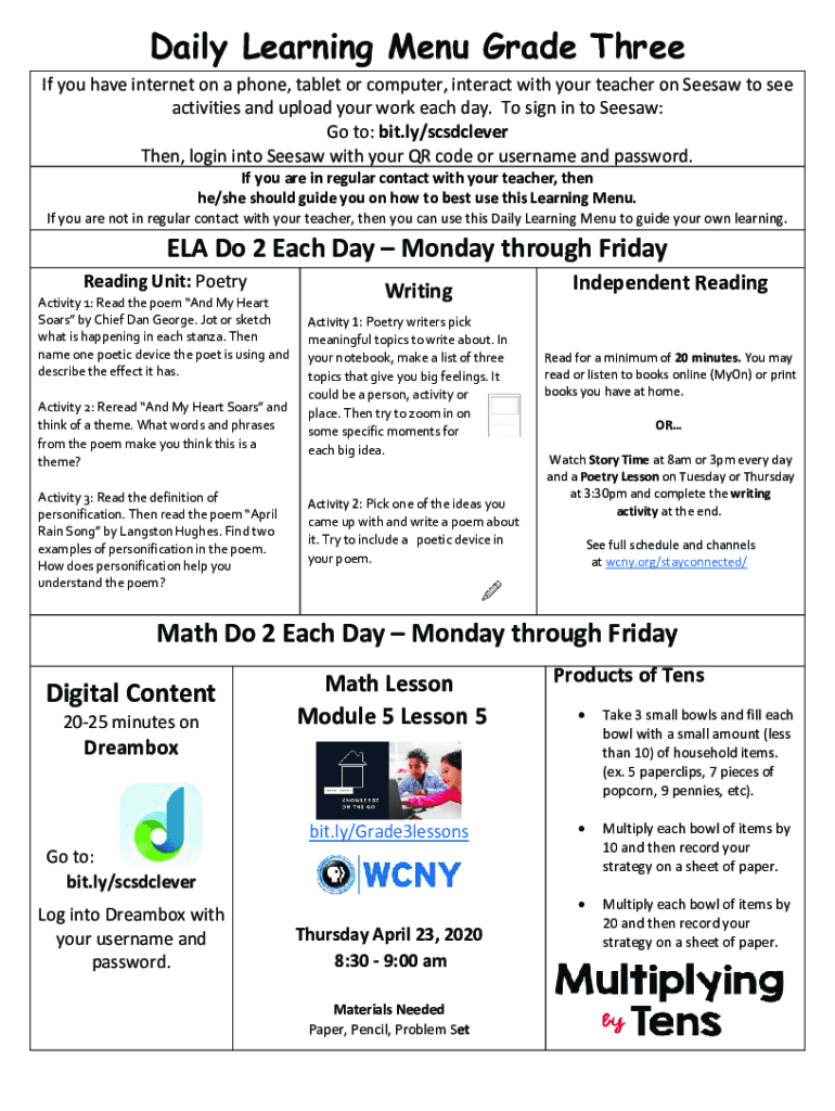 Daily Learning Menu Grade Three If you have internet on a phone, tablet or computer, interact with your teacher on Seesaw to see activities and upload your work each day. To sign in to Seesaw: Go