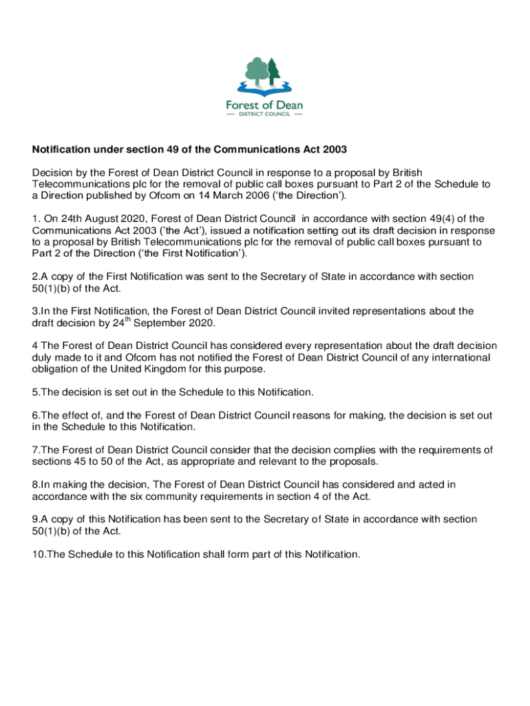 Notification under section 49 of the Communications Act 2003 Decision by the Forest of Dean District Council in response to a proposal by British Telecommunications plc for the removal of public call