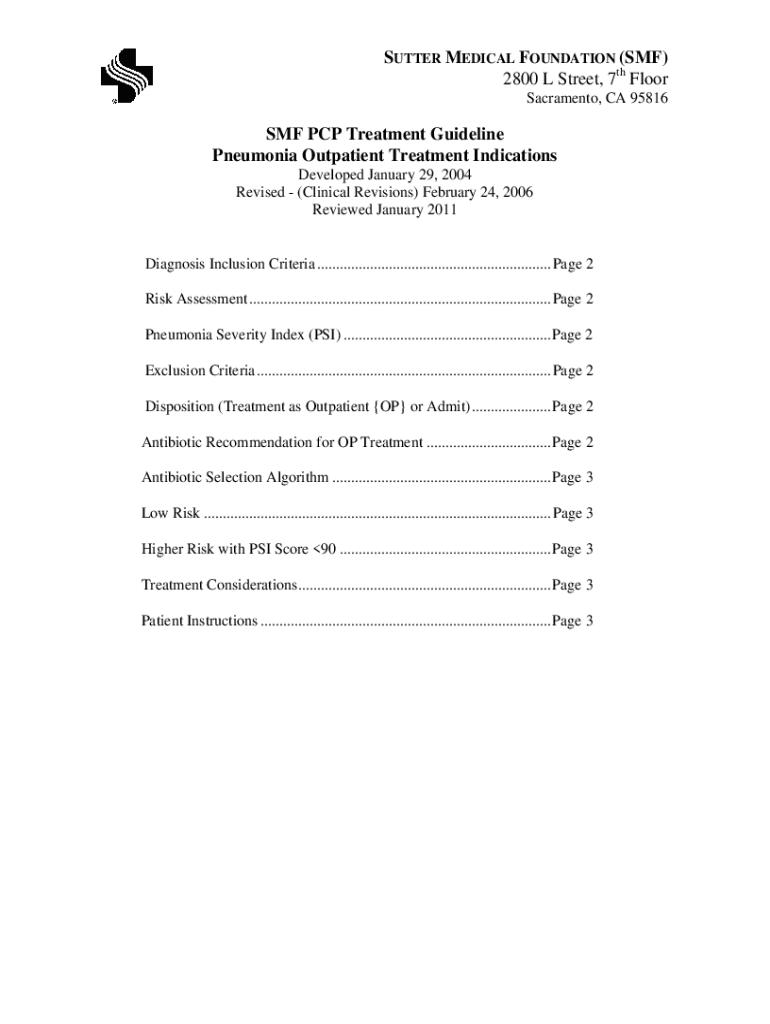 SUTTER MEDICAL FOUNDATION (SMF) 2800 L Street, 7th Floor Sacramento, CA 95816SMF PCP Treatment Guideline Pneumonia Outpatient Treatment Indications Developed January 29, 2004Revised (Clinical Revisions)