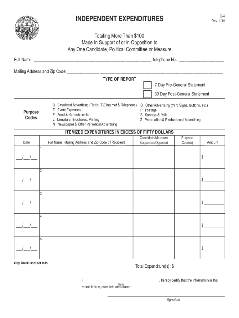 C4 Rev. 1/15INDEPENDENT EXPENDITURES Totaling More Than $100 Made In Support of or in Opposition to Any One Candidate, Political Committee or Pleasureful Name: ___ Telephone No.: ___ Mailing Address