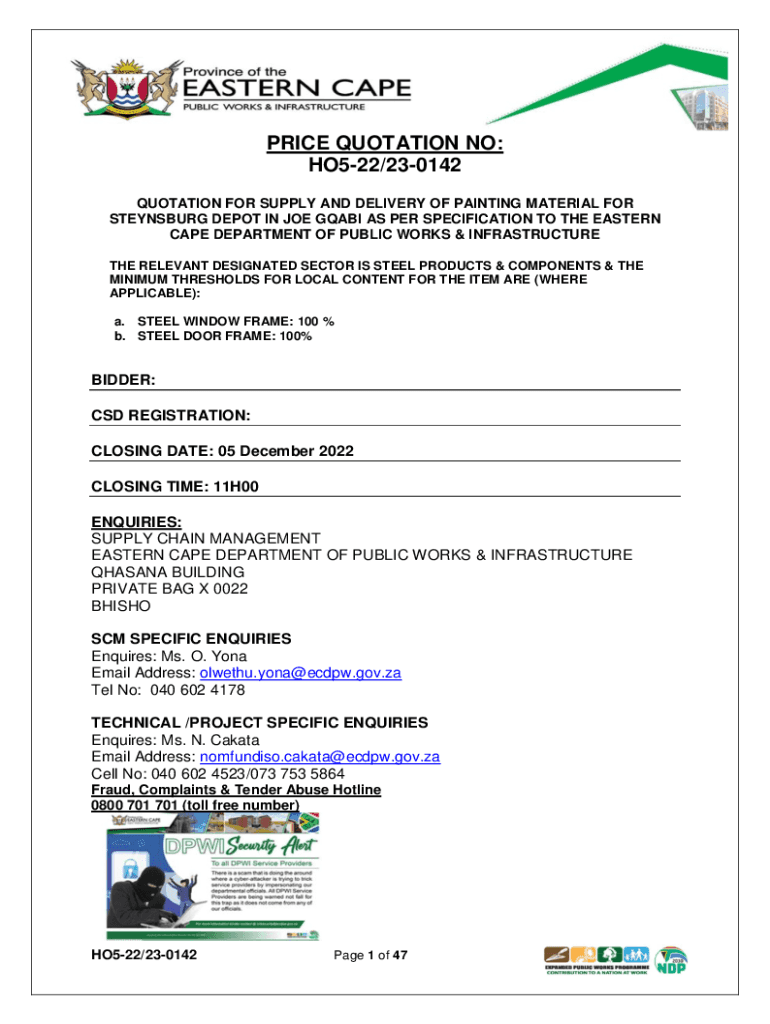 PRICE QUOTATION NO: HO522/230142 QUOTATION FOR SUPPLY AND DELIVERY OF PAINTING MATERIAL FOR FLENSBURG DEPOT IN JOE GQ ABI AS PER SPECIFICATION TO THE EASTERN CAPE DEPARTMENT OF PUBLIC WORKS & INFRASTRUCTURE