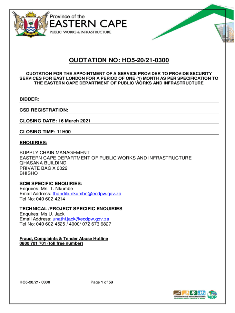 QUOTATION NO: HO520/210300 QUOTATION FOR THE APPOINTMENT OF A SERVICE PROVIDER TO PROVIDE SECURITY SERVICES FOR EAST LONDON FOR A PERIOD OF ONE (1) MONTH AS PER SPECIFICATION TO THE EASTERN CAPE DEPARTMENT