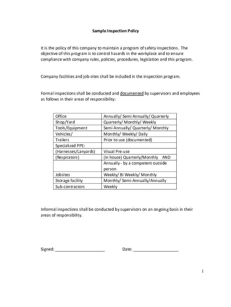Sample Inspection Policy It is the policy of this company to maintain a program of safety inspections. The objective of this program is to control hazards in the workplace and to ensure compliance