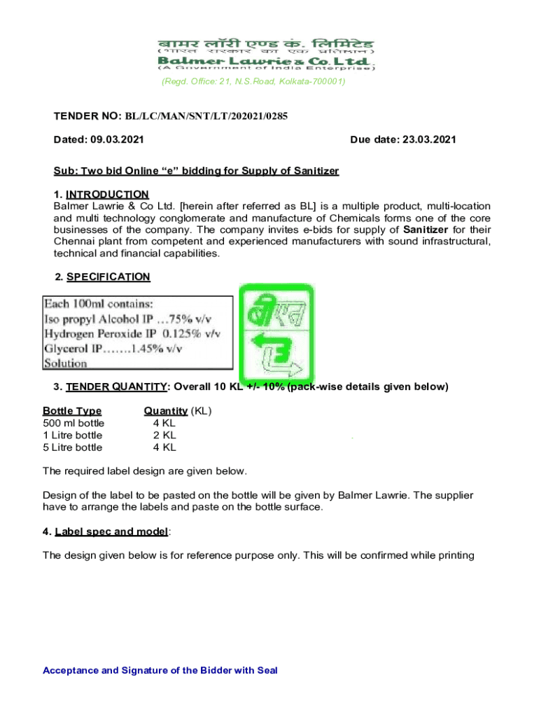 (Red. Office: 21, N.S. Road, Kolkata700001)TENDER NO: BL/LC/MAN/SET/LT/202021/0285 Dated: 09.03.2021Due date: 23.03.2021Sub: Two bid Online e bidding for Supply of Sanitizer 1. INTRODUCTION Palmer