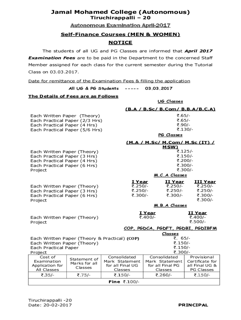 Jamal Mohamed College (Autonomous) Tiruchirappalli 20Autonomous Examination April2017 Refinance Courses (MEN & WOMEN) NOTICE The students of all UG and PG Classes are informed that April 2017 Examination