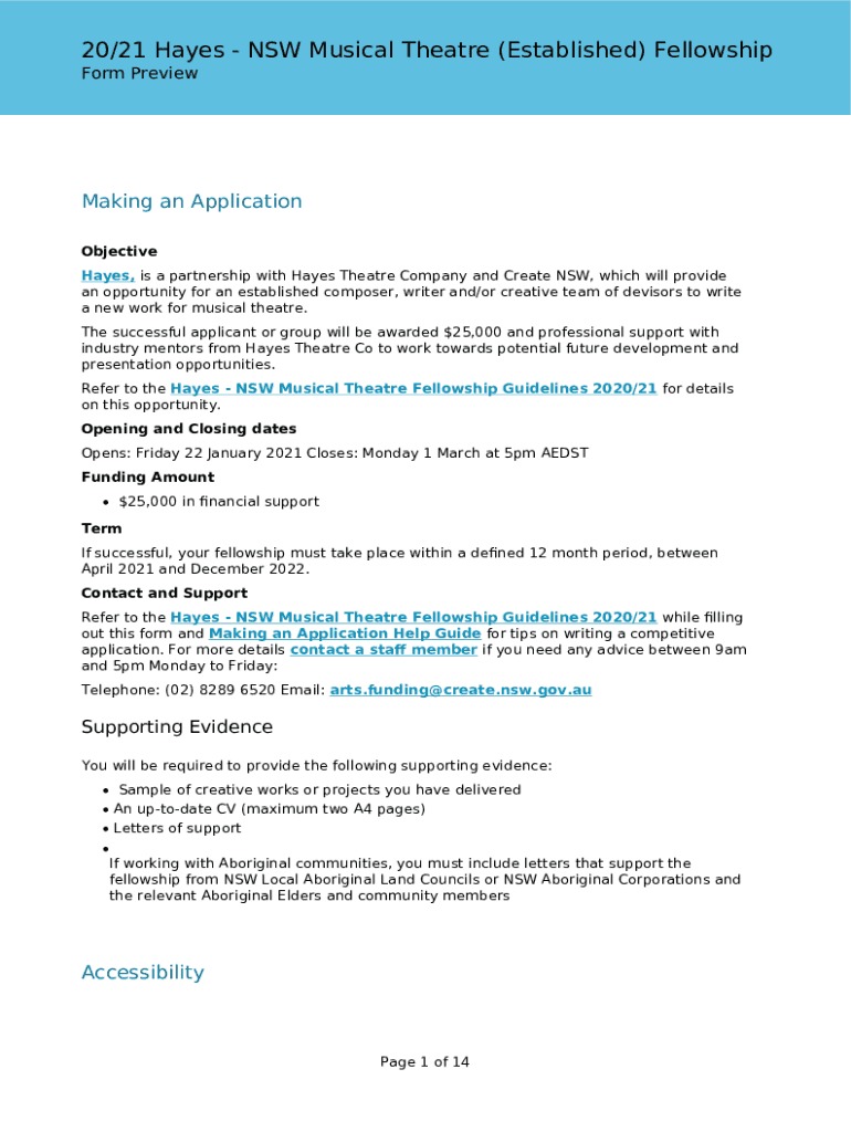 20/21 Hayes NSW Musical Theater (Established) Fellowship Form Previewing an Application Objective Hayes, is a partnership with Hayes Theater Company and Create NSW, which will provide an opportunity