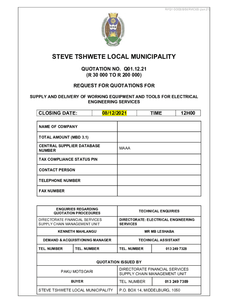 RFQ1 GOODS/SERVICES (Jun.21)STEVE THERE LOCAL MUNICIPALITY