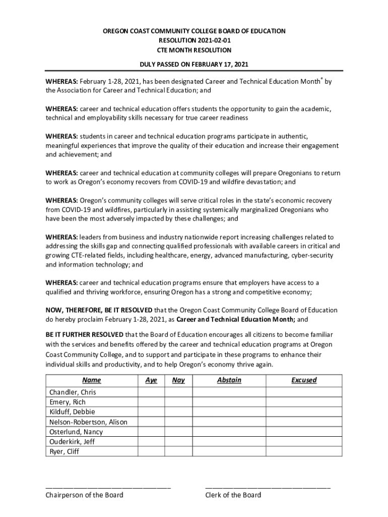 OREGON COAST COMMUNITY COLLEGE BOARD OF EDUCATION RESOLUTION 20210201 CTE MONTH RESOLUTION DULY PASSED ON FEBRUARY 17, 2021WHEREAS: February 128, 2021, has been designated Career and Technical Education