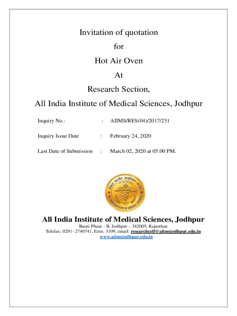 Invitation of quotation for Hot Air Oven At Research Section, All India Institute of Medical Sciences, Jodhpur Inquiry No.::AIMS/RES(04)/2017/251Inquiry Issue Date:February 24, 2020Last Date of Submission:March