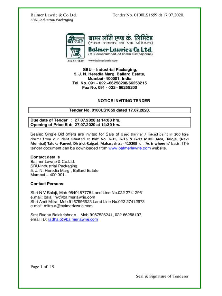 Palmer Laurie & Co Ltd. Tender No. 0100LS1659 DT 17.07.2020.SBS: Industrial Packaging, 5, J. N. Hardin Mary, Ballard Estate, Mumbai 400001, India Tel. No. 091 022 66258208/66258215 Fax No. 091 022