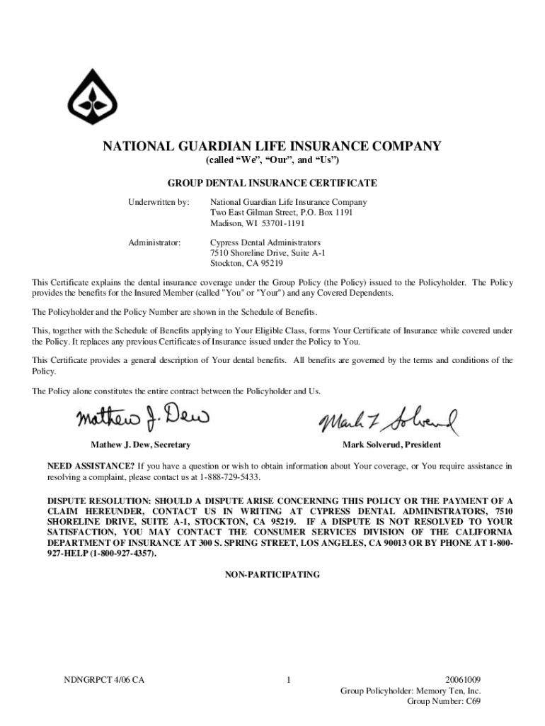 NATIONAL GUARDIAN LIFE INSURANCE COMPANY (called We, Our, and Us) GROUP DENTAL INSURANCE CERTIFICATE Underwritten by:National Guardian Life Insurance Company Two East Gilman Street, P.O. Box 1191