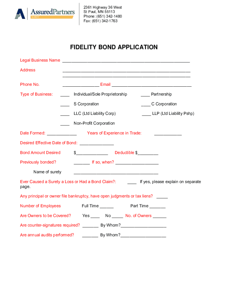 2361 Highway 36 West St Paul, MN 55113 Phone: (651) 3421480 Fax: (651) 3421763SURETYFIDELITY BOND APPLICATION Legal Business Name ___ Address___ ___Phone No.___ Email ___Type of Business:___Individual/Sole