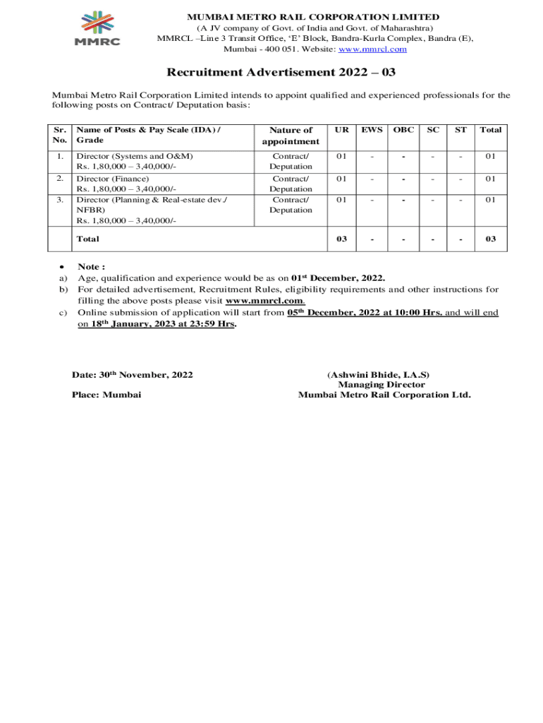 MUMBAI METRO RAIL CORPORATION LIMITED (A JV company of Govt. of India and Govt. of Maharashtra) MMR CL Line 3 Transit Office, E Block, BandraKurla Complex, Sandra (E), Mumbai 400 051. Website: www.mmrcl.comRecruitment