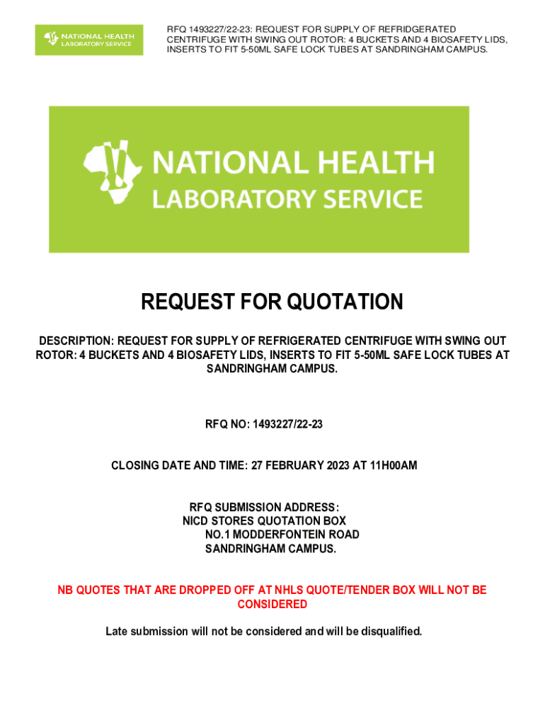 RFQ 1493227/2223: REQUEST FOR SUPPLY OF REFRIGERATED CENTRIFUGE WITH SWING OUT ROTOR: 4 BUCKETS AND 4 BIOSAFETY LIDS, INSERTS TO FIT 550ML SAFE LOCK TUBES AT SANDRINGHAM CAMPUS.REQUEST FOR QUOTATION