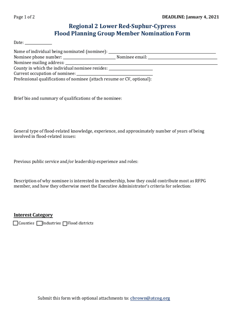 The Region 2 Lower RedSulphurCypress Regional Flood Planning Group (RPG) is soliciting nominations