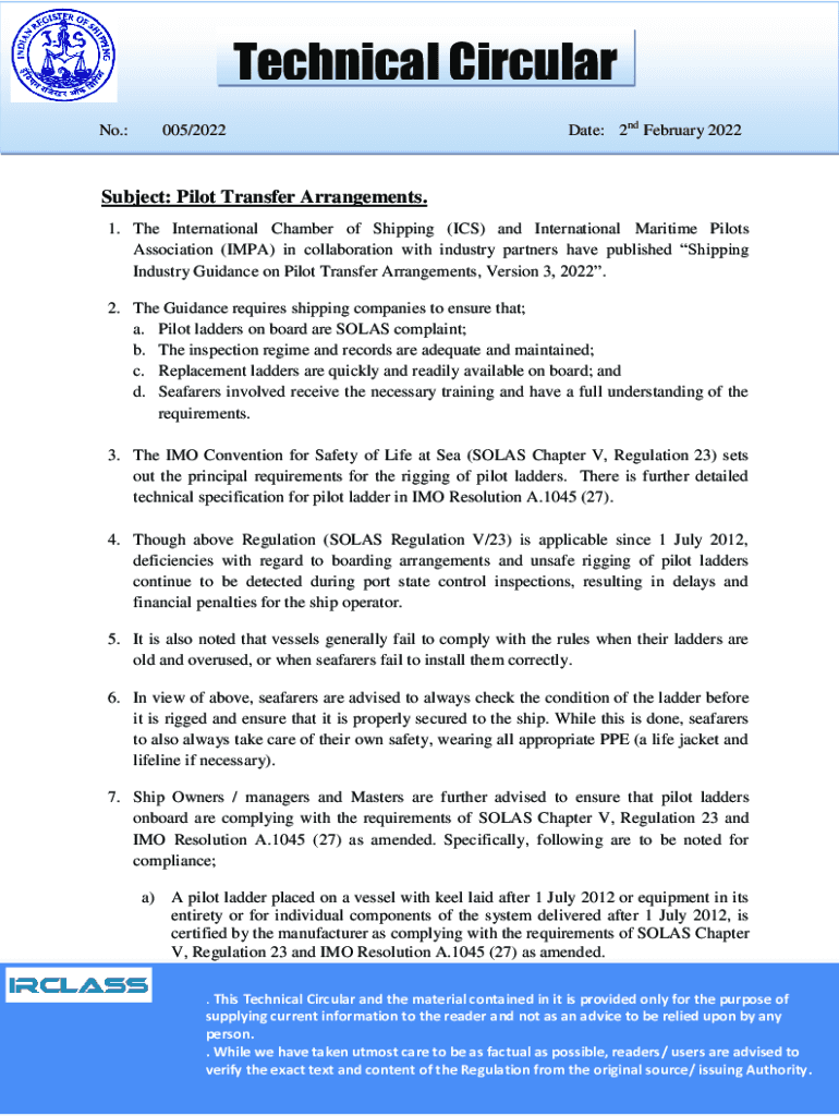 Technical Circular No.:005/2022Date: 2nd February 2022Subject: Pilot Transfer Arrangements. 1. The International Chamber of Shipping (ICS) and International Maritime Pilots Association (IPA) in collaboration