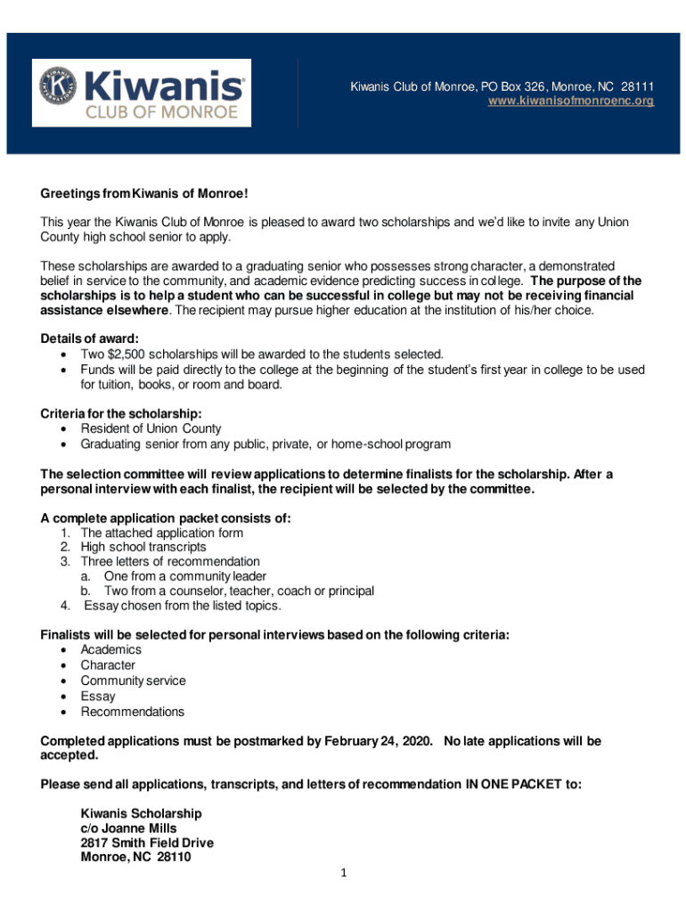 Kiwanis Club of Monroe, PO Box 326, Monroe, NC 28111 www.kiwanisofmonroenc.orgGreetings from Kiwanis of Monroe! This year the Kiwanis Club of Monroe is pleased to award two scholarships, and we'd