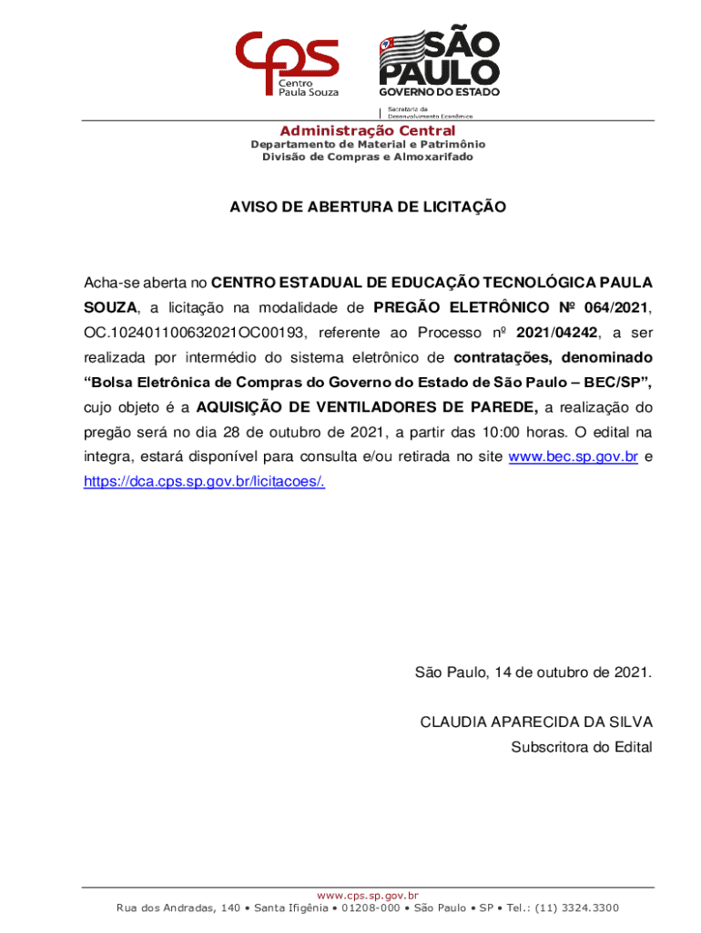 Divisor de Compras e AlmoxarifadoAVISO DE APERTURE DE LICITAOAchase Alberta no CENTR GRADUAL DE EDUC AO TECHNOLOGICAL PAULA