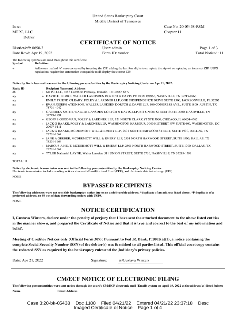 United States Bankruptcy Court Middle District of Tennessee In re: MTC, LLC Debtor Case No. 2005438RSM Chapter 11CERTIFICATE OF NOTICE District/off: 06503 Date RCD: Apr 19, 2022User: admin Form ID: