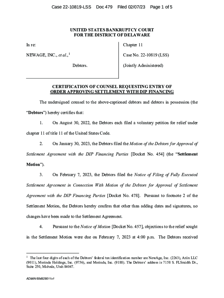 Case 2210819LSSDoc 479Filed 02/07/23Page 1 of 5UNITED STATES BANKRUPTCY COURT FOR THE DISTRICT OF DELAWARE In re:Chapter 11NEWAGE, INC., et al., 1Case No. 2210819 (LESS) Debtors.(Jointly Administered)CERTIFICATION