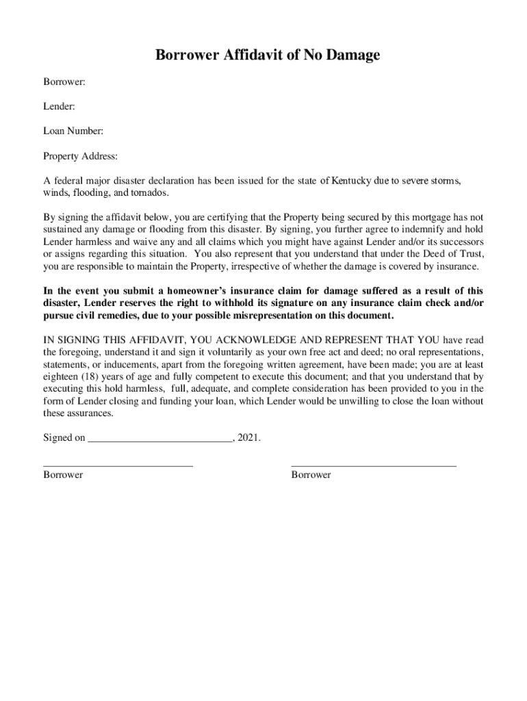 Borrower Affidavit of No Damage Borrower: Lender: Loan Number: Property Address: A federal major disaster declaration has been issued for the state of Kentucky due to severe storms, winds, flooding,