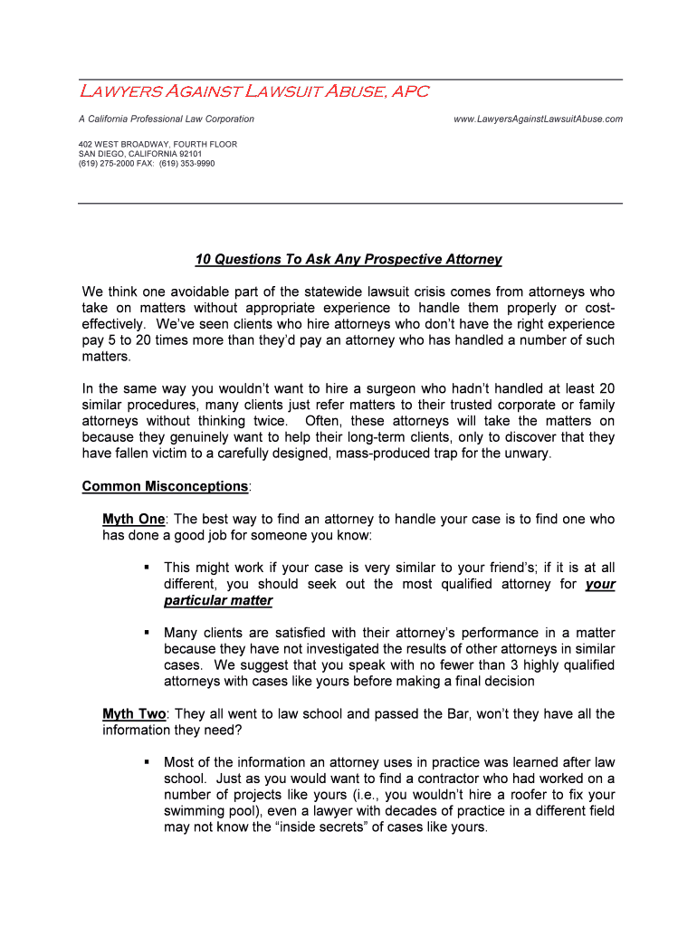 A California Professional Law Corporation. LawyersAgainstLawsuitAbuse.com402 WEST BROADWAY, FOURTH FLOOR
