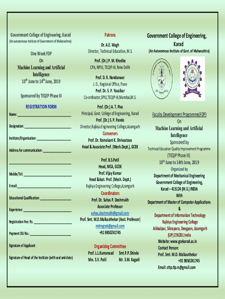 Government College of Engineering, Kara (An autonomous Institute of Government of Maharashtra)One Week FDP On Machine Learning and Artificial Intelligence TH 10 June to 14th June 2019 Sponsored by
