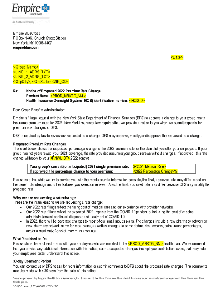 Empire Blue Cross PO Box 1407, Church Street Station New York, NY 100081407 empireblue.com Date Group Name LINE_1_ADRS_TXT LINE_2_ADRS_TXT Gravity, Prostate ZIP_CD Re:Notice of Proposed 2022 Premium