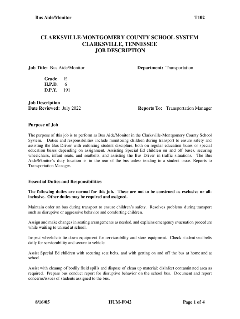 Bus Aide/MonitorT102CLARKSVILLEMONTGOMERY COUNTY SCHOOL SYSTEM CLARKSVILLE, TENNESSEE JOB DESCRIPTION Job Title: Bus Aide/Monitor Grade H.P.D. D.P.Y. Department: Transportation 6 191Job Description