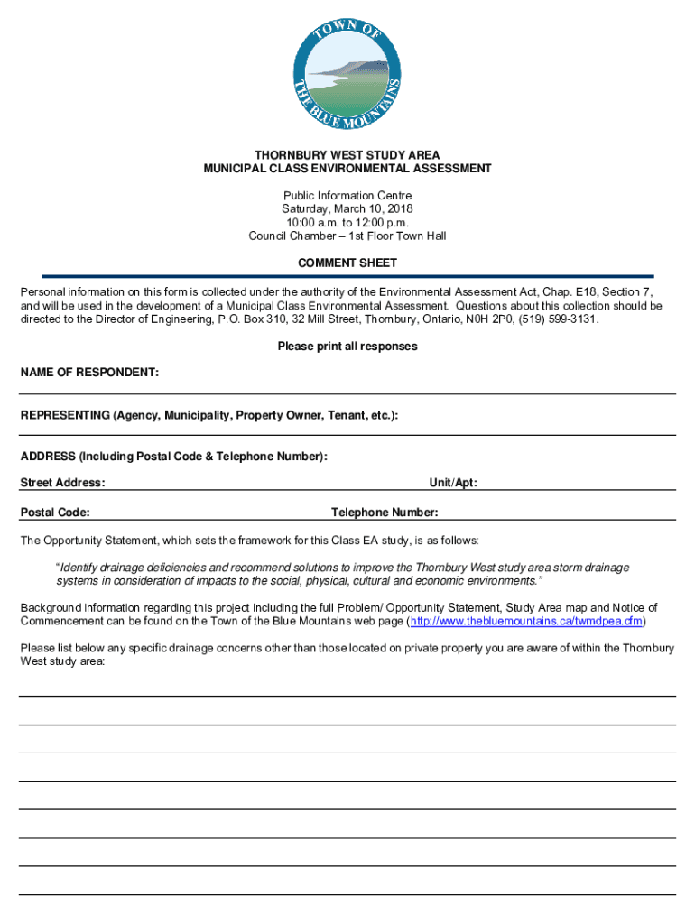 THORBURN WEST STUDY AREA MUNICIPAL CLASS ENVIRONMENTAL ASSESSMENT Public Information Center Saturday, March 10, 2018 10:00 a.m. to 12:00 p.m. Council Chamber 1st Floor Town Hall COMMENT SHEET Personal