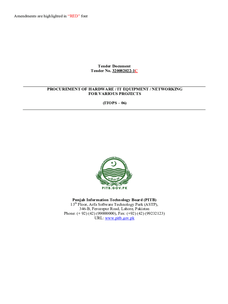 Amendments are highlighted in RED contender Document Tender No. 3200820221CPROCUREMENT OF HARDWARE / IT EQUIPMENT / NETWORKING FOR VARIOUS PROJECTS (STOPS 06)Punjab Information Technology Board (PIT)