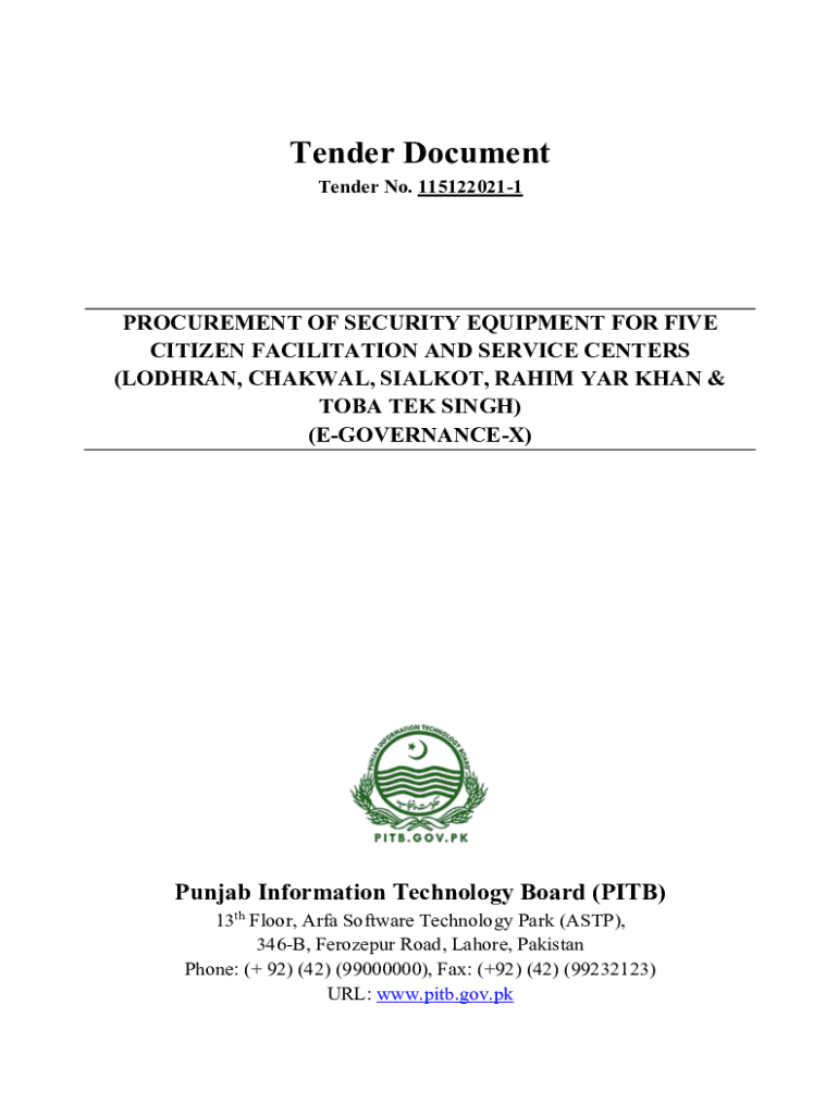 Tender Document Tender No. 1151220211PROCUREMENT OF SECURITY EQUIPMENT FOR FIVE CITIZEN FACILITATION AND SERVICE CENTERS (COCHRAN, CHANTAL, SIALKOT, RAHIM YAR KHAN & TOBY TEN SINGH) (GOVERNANCE)Punjab