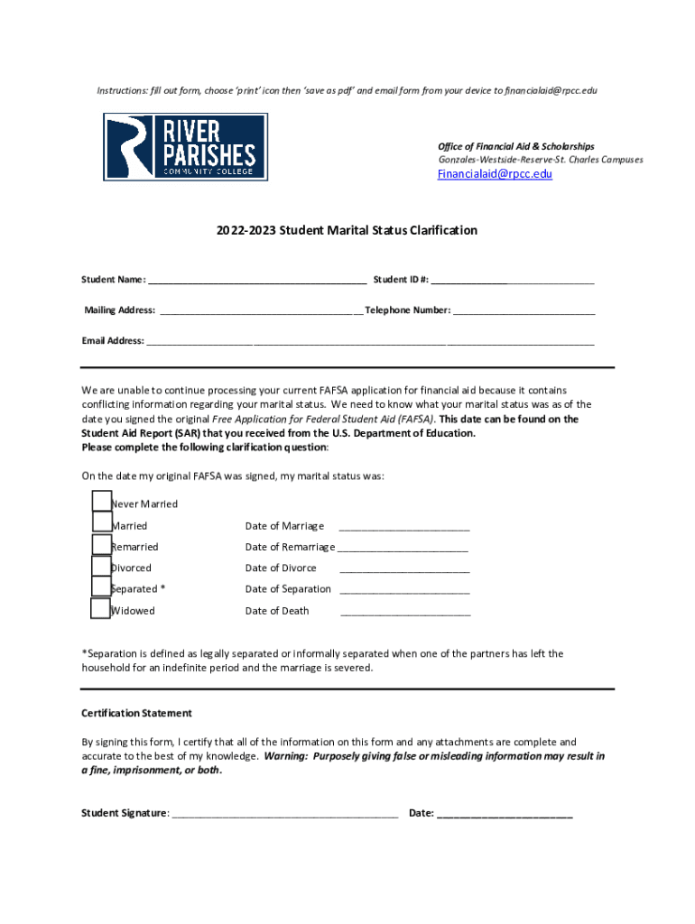 Instructions: fill out form, choose print icon then save as PDF and email form from your device to financialaid@rpcc.eduOffice of Financial Aid & Scholarships GonzalesWestsideReserveSt. Charles CampusesFinancialaid@rpcc.edu20222023