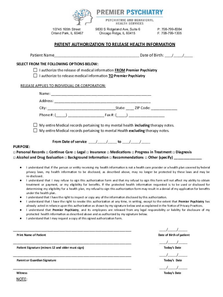 10745 165th Street Orland Park, IL 604679830 S Ridgeland Ave, Suite 6 Chicago Ridge, IL 60415P: 7087998384 F: 7087991305PATIENT AUTHORIZATION TO RELEASE HEALTH INFORMATION Pa ENT Name___ Date of Birth: