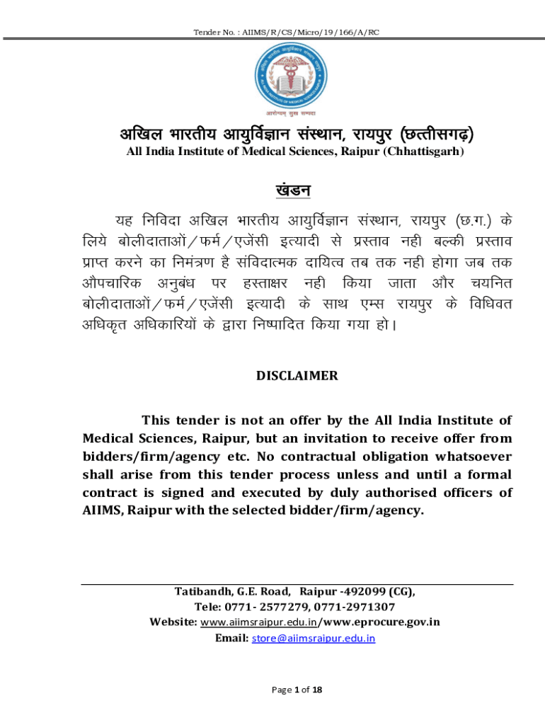 Tender No. AIMS/R/CS/Micro/19/166/A/CVF[KY Hikers; VK;quokka laLFkku] JK;IQ NRL+