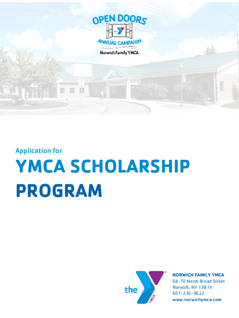 Application for YMCA SCHOLARSHIP PROGRAMNORWICH FAMILY YMCA 6870 North Broad Street Norwich, NY 13815 6073369622 www.norwichymca.comThe Norwich Family YMCA is proud to offer its Open Doors Scholarship