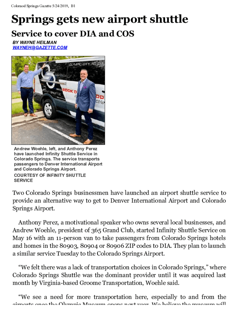 Colorado Springs Gazette 5/24/2019, B1Springs gets new airport shuttle Service to cover DID and COS BY WAYNE HELLMAN WAYNEH@GAZETTE.COMAndrew Wobble, left, and Anthony Perez have launched Infinity