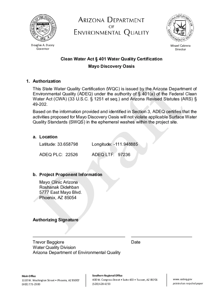 Douglas A. Ducey GovernorMisael Cabrera DirectorClean Water Act 401 Water Quality Certification Mayo Discovery Oasis 1. Authorization This State Water Quality Certification (QC) is issued by the Arizona