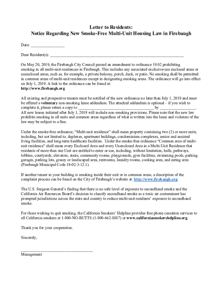 Letter to Residents: Notice Regarding New Smoke-free MultiUnit Housing Law in Firebug Date: ___ Dear Resident(s): ___ On May 20, 2019, the Firebug City Council passed an amendment to ordinance 19.02
