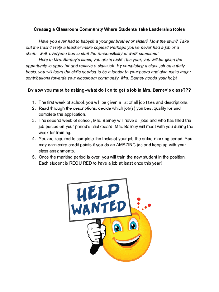 Creating a Classroom Community Where Students Take Leadership Roles Have you ever had to babysit a younger brother or sister? Mow the lawn? Take out the trash? Help a teacher make copies? Perhaps