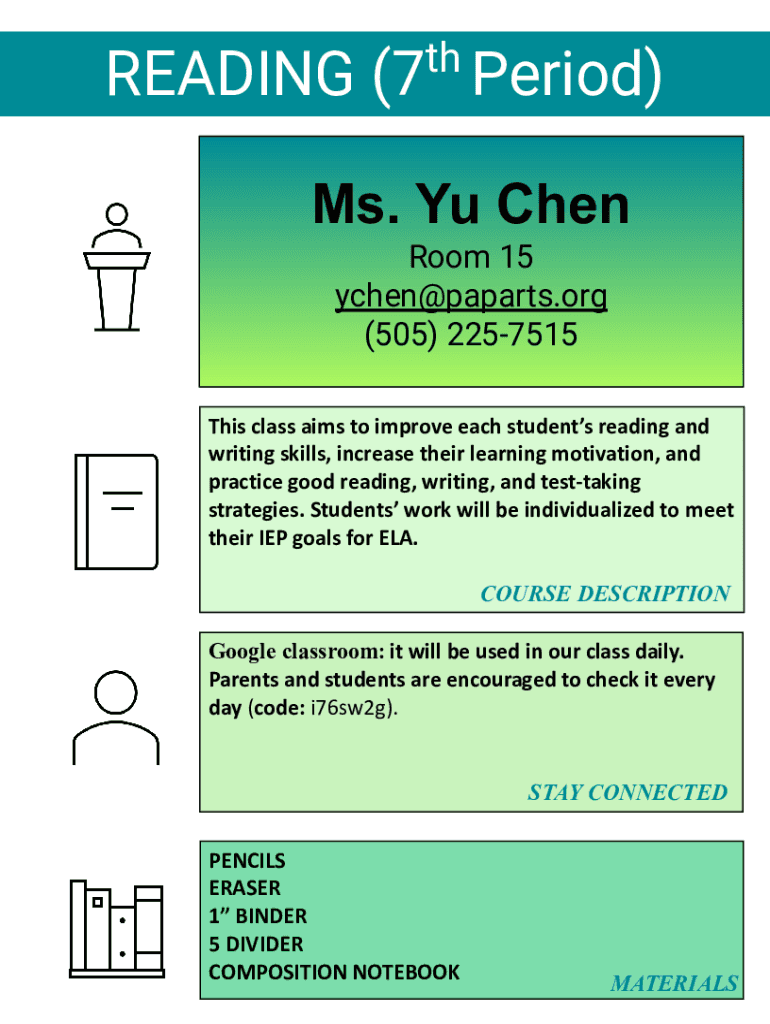 Threading (7 Period) Ms. You Chen Room 15 ychen@paparts.org (505) 2257515 This class aims to improve each student's reading and writing skills, increase their learning motivation, and practice good