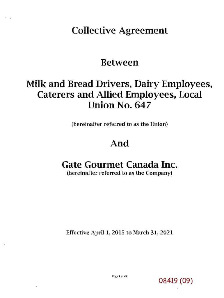 Collective Agreement Between Milk and Bread Drivers, Dairy Employees, Caterers and Allied Employees, Local Union No. 647 (hereinafter referred to as the Union)And Gate Gourmet Canada Inc. (hereinafter