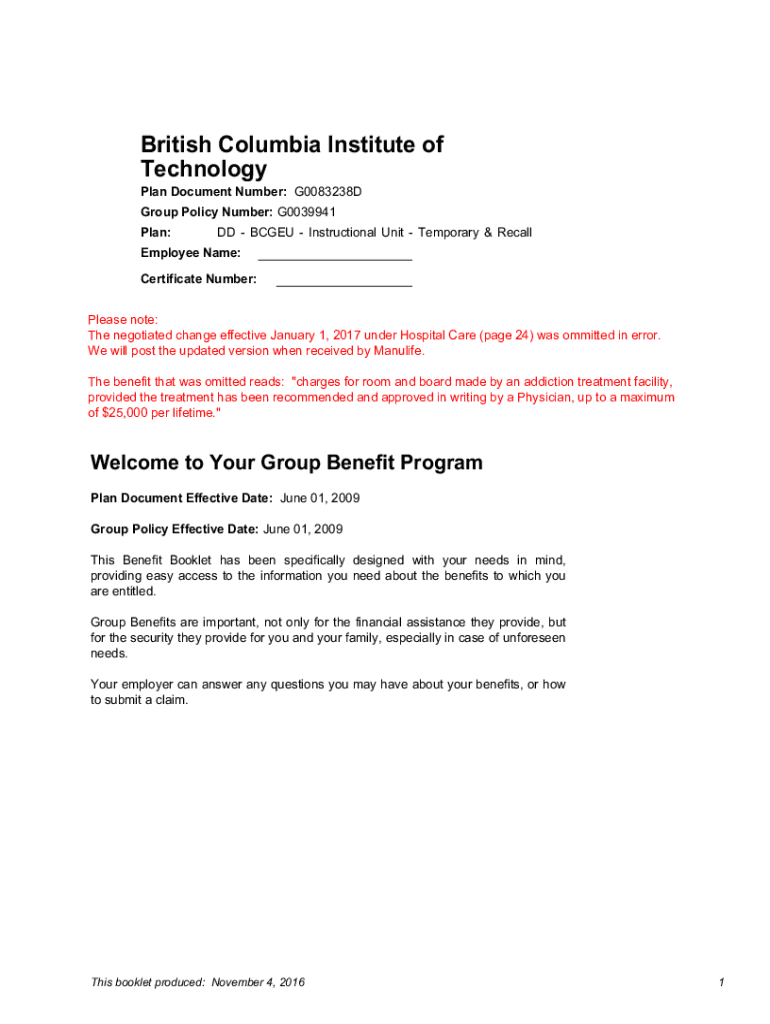 British Columbia Institute of Technology Plan Document Number: G0083238D Group Policy Number: G0039941 Plan:DD BCG EU Instructional Unit Temporary & RecallEmployee Name: Certificate Number: Please