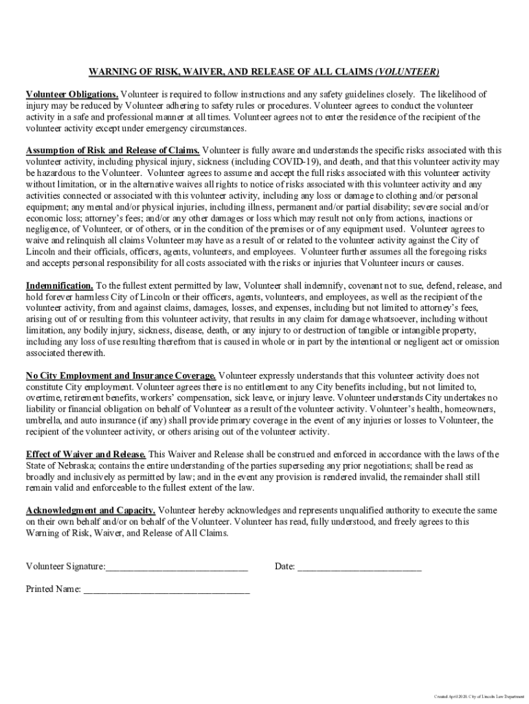 WARNING OF RISK, WAIVER, AND RELEASE OF ALL CLAIMS (VOLUNTEER) Volunteer Obligations. Volunteer is required to follow instructions and any safety guidelines closely. The likelihood of injury may be