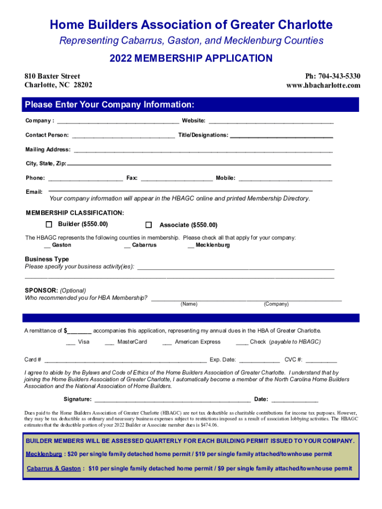 Home Builders Association of Greater Charlotte Representing Cabarets, Gaston, and Mecklenburg Counties 2022 MEMBERSHIP APPLICATION 810 Baxter Street Charlotte, NC 28202Ph: 7043435330 www.hbacharlotte.comPlease