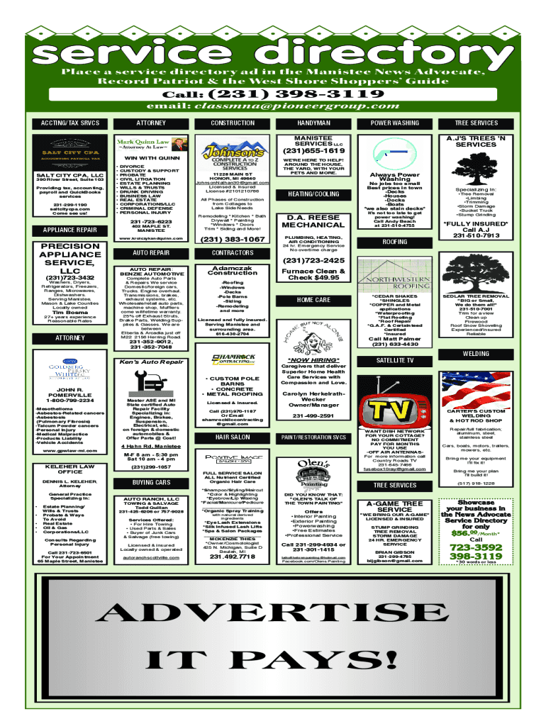 Service directory Place a service directory ad in the Minister News Advocate, Record Patriot & the West Shore Shoppers Guide Call: (231) 3983119 email: classmna@pioneergroup.com ACTING/TAX SRVCSATTORNEYCONSTRUCTIONHANDYMANPOWER