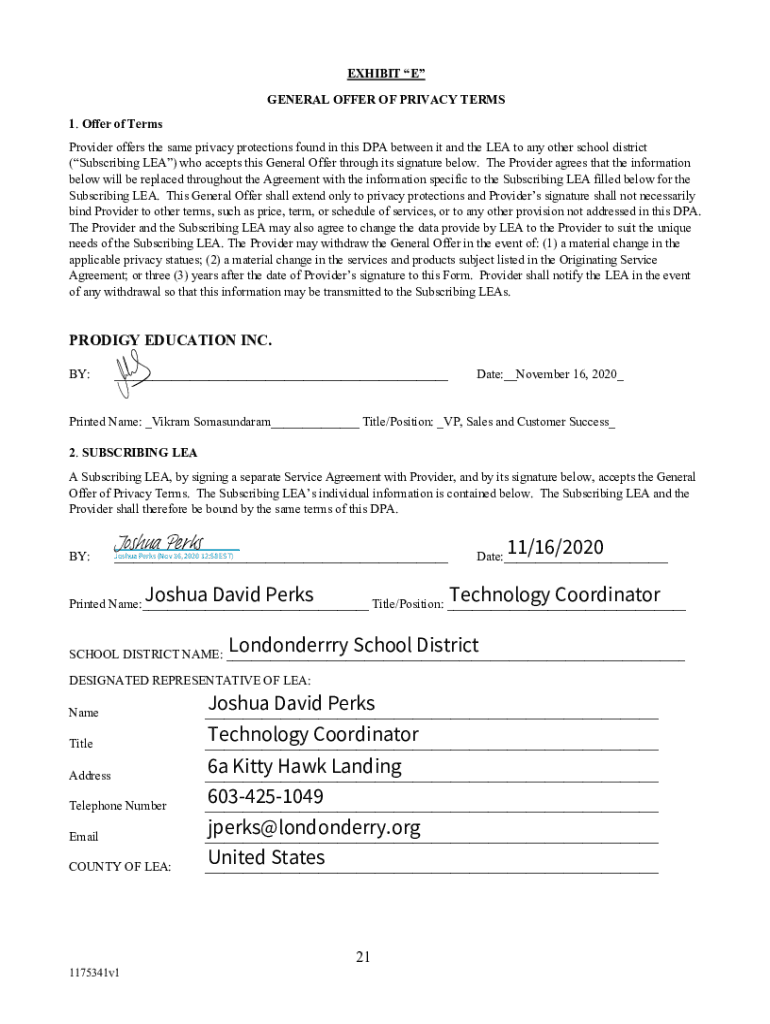 EXHIBIT E GENERAL OFFER OF PRIVACY TERMS 1. Offer of Terms Provider offers the same privacy protections found in this DPA between it and the LEA to any other school district (Subscribing LEA) who