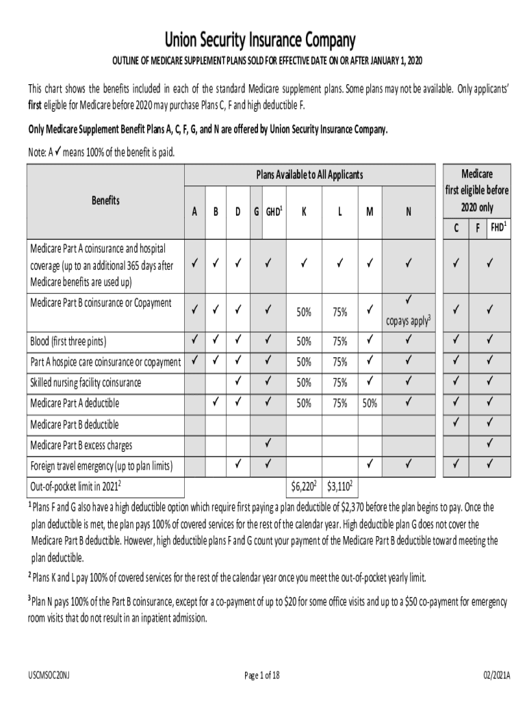 OUTLINE OF MEDICARE SUPPLEMENT PLANS SOLD FOR EFFECTIVE DATE ON OR AFTER JANUARY 1, 2020This chart shows the benefits included in each of the standard Medicare supplement plans. Some plans may not