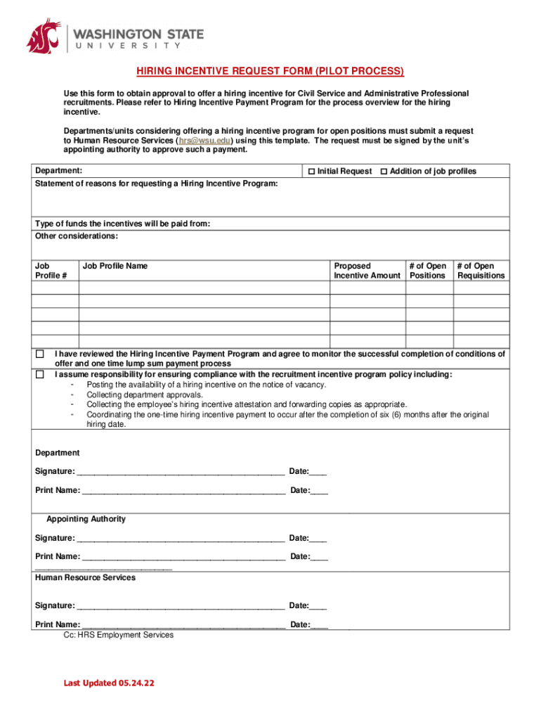 HIRING INCENTIVE REQUEST FORM (PILOT PROCESS) Use this form to obtain approval to offer a hiring incentive for Civil Service and Administrative Professional recruitments. Please refer to Hiring Incentive